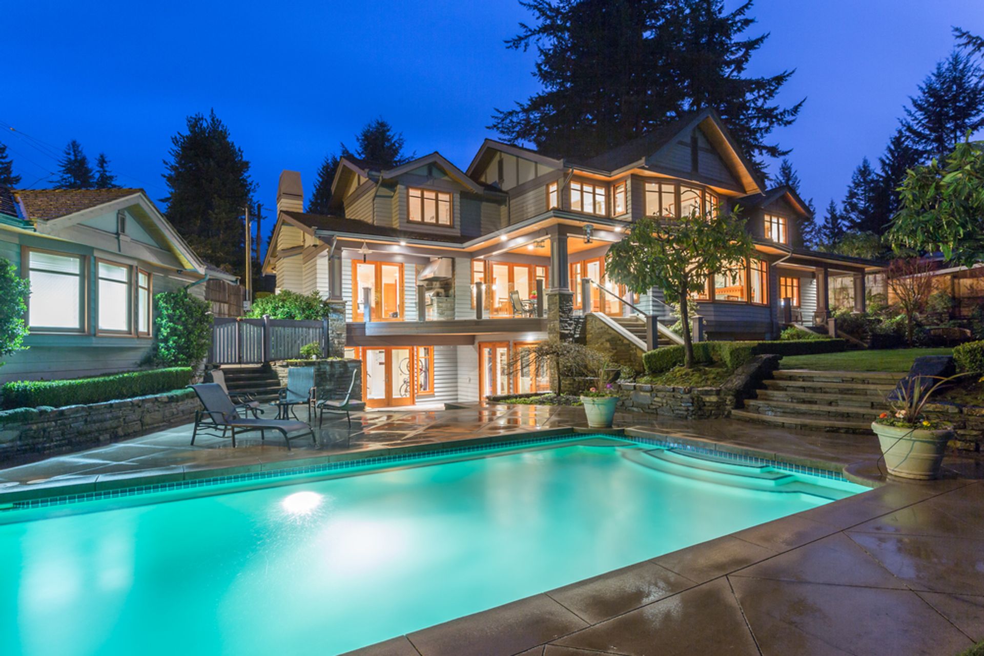 WESTCOAST CRAFTSMAN STYLE HOME CREATES FAMILY MEMORIES AND VALUES WHILE INDUCING RELAXATION. This 'Once in a Lifetime' Edgemont Village 'Sunset Gardens' Craftmans Style Family Home featured in Canadian Home & Country twice in recent years, the home stands tall at 6300 sq.ft of pure custom design with a stunning build quality that is instantly recognized. Architecturally designed by Award Winning Bryce Ferguson and built by West Vancouver's own Paul Fedusiak… of Goldwood Homes in 2002. 4173 Sunset is situated on an INCREADIBLY RARE 26,000 sq.ft. LIONS GATE VIEW LOT on the South Side Bluff which gives the property ALL DAY SUN EXPOSURE and PARKLIKE PRIVACY. A must see!!